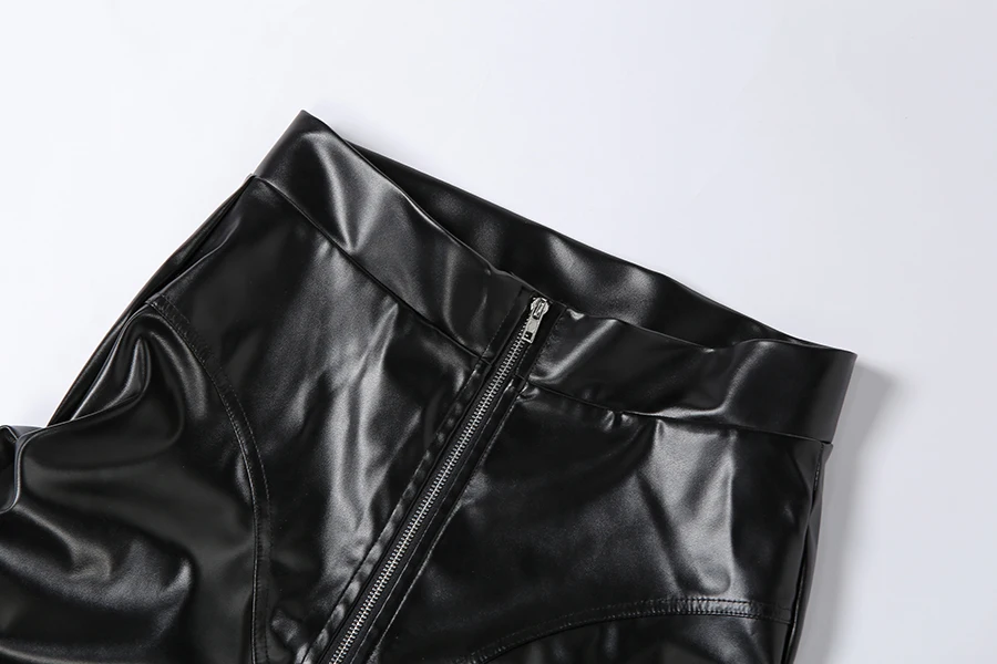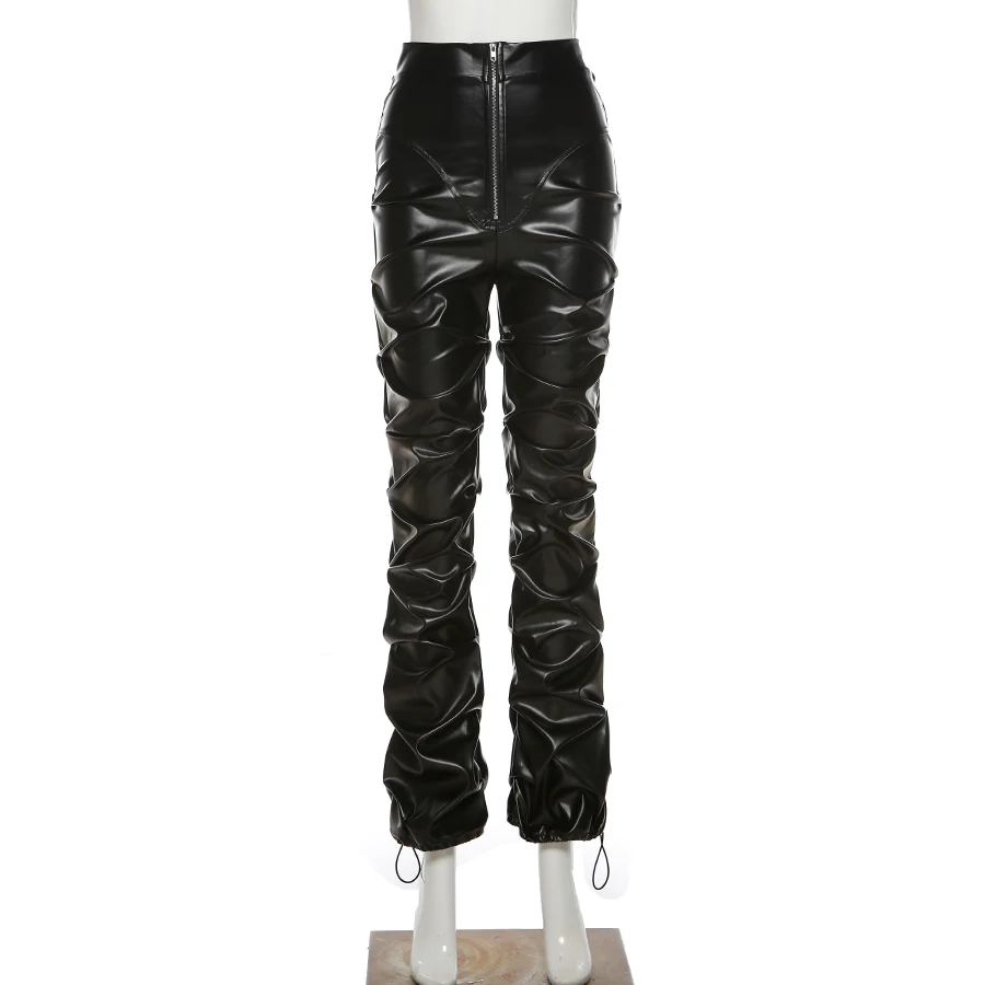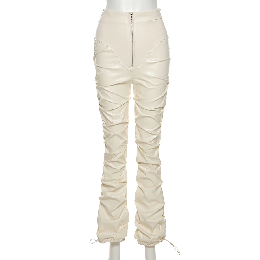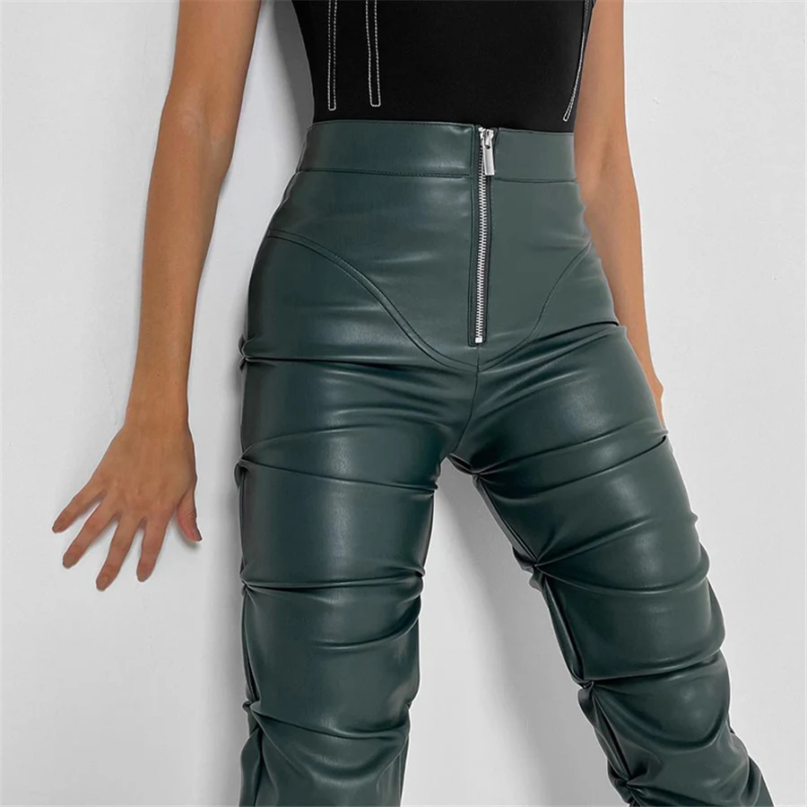 Sisterlinda Faux Leather Stacked Y2K Pant Feminino Cintura Alta com Zíper Fenda Lateral Hipster Streetwear Feminino Moda Fina Calças Longas